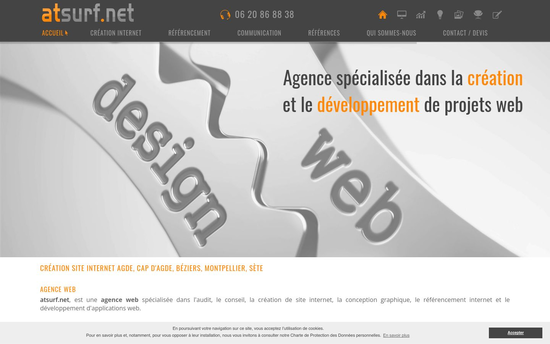 atsurf.net Création de Site Internet. atsurf.net propose la Création de sites Web Agde, Cap d'Agde, Béziers, Montpellier, Sète, Hérault, Paris.